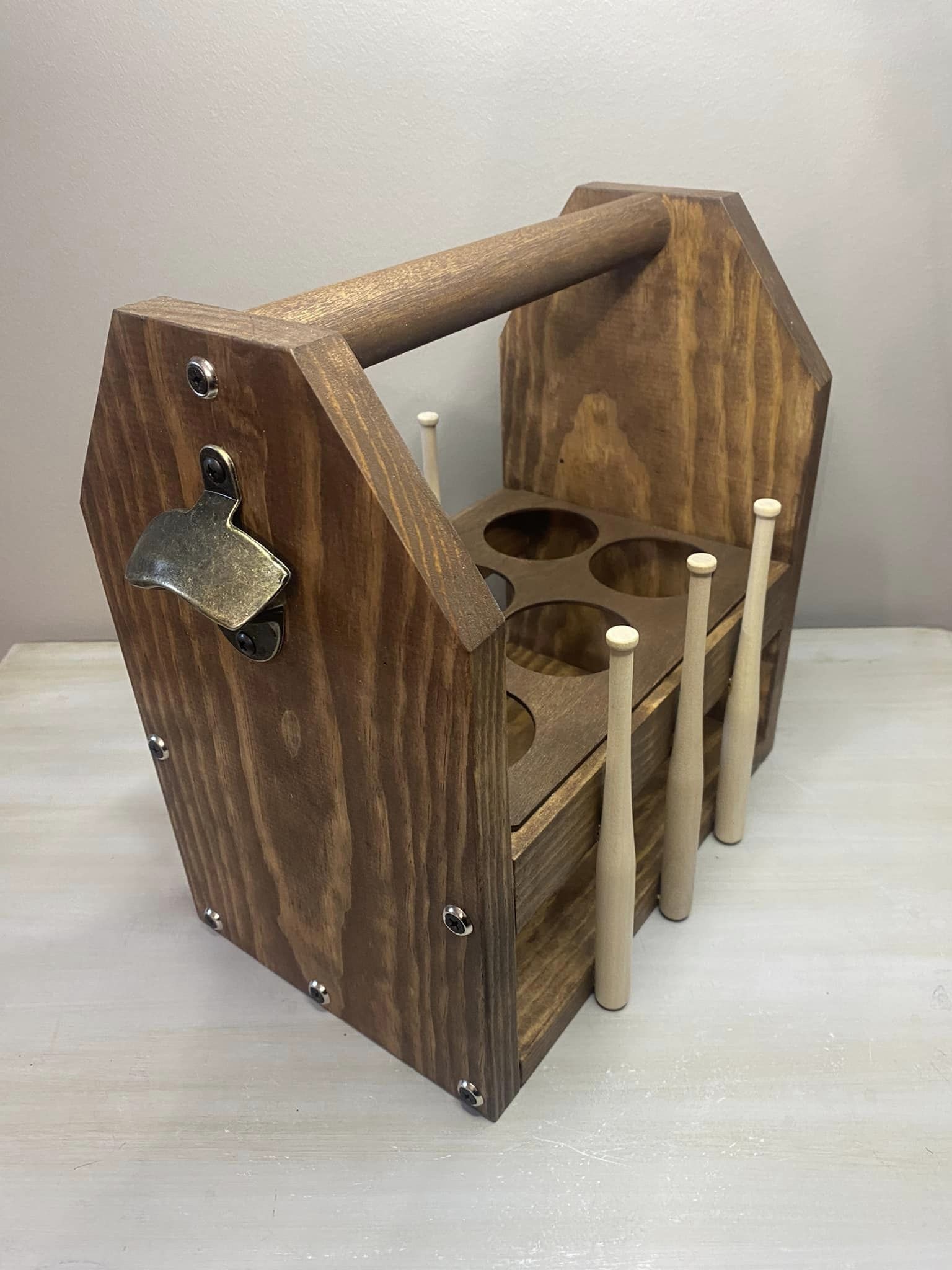 Be the MVP of your team with this baseball-themed and customizable drink caddy. Wooden carrier with bottle opener for beer, soda or seltzer. Fits most standard bottles and cans.  Add logo, art or text on 1 or both sides. Single-sided designs will be engraved underneath the bottle opener.